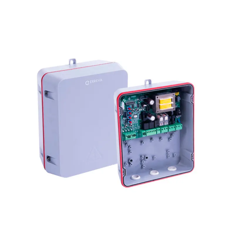 El cuadro de maniobras Erreka Vivo M202 universal que permite la conexión de 2 motores que incorporen freno eléctrico para puertas de garaje abatibles y de todo tipo de puertas que incorporen un motor de corriente alterna. Compatible con motores con freno CICLON, MAGIC y DRACO. Posibilidad de instalar dispositivos de seguridad como fotocélulas, receptores y mandos de garaje compatibles.