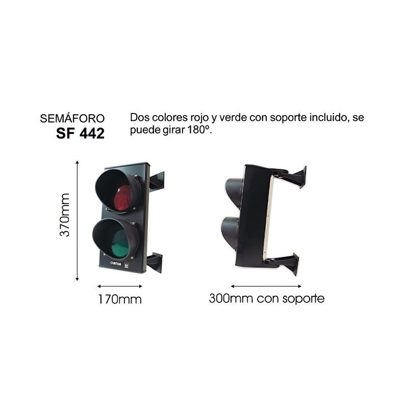 Incluye dos unidades de semáforos LED, mostrando los colores rojo y verde. Estos semáforos son visibles y duraderos, aptos para uso tanto interior como exterior. Cada unidad mide 170 x 370 x 300 mm y funciona con una alimentación de 230 Vac 50Hz.