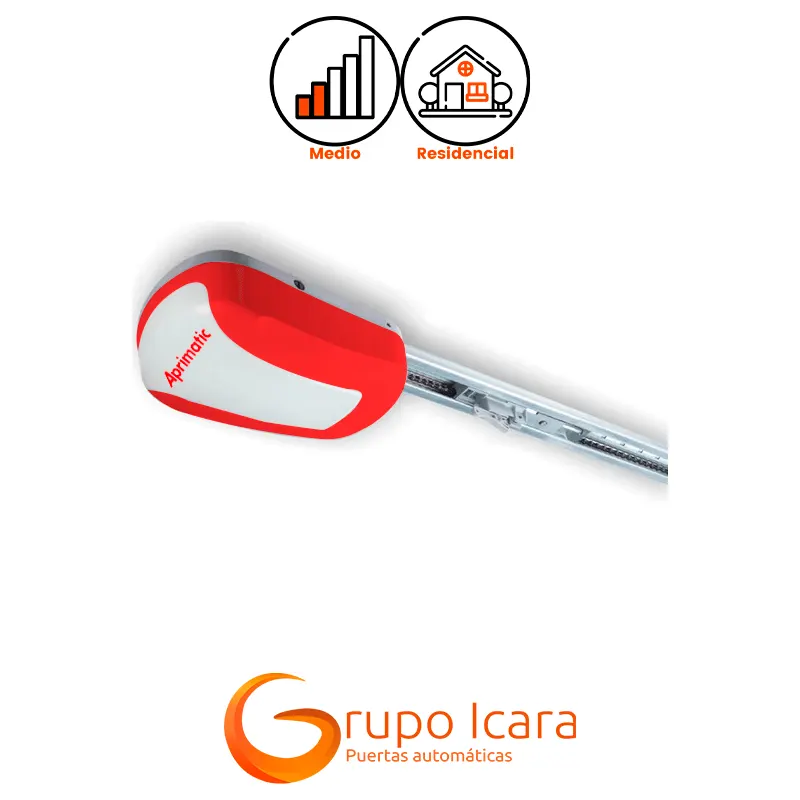 Aprimatic REDMATIC + guía motor puerta seccional de garaje electromecánico de uso residencial para puertas desde los 7m2 hasta los 21 m2. Incorpora antiaplastamiento electrónico y sistema de reconocimiento automático de recorrido por encoder. Con fuerza de empuje de 600 N hasta 1800 N para puertas seccionales de uso particular.